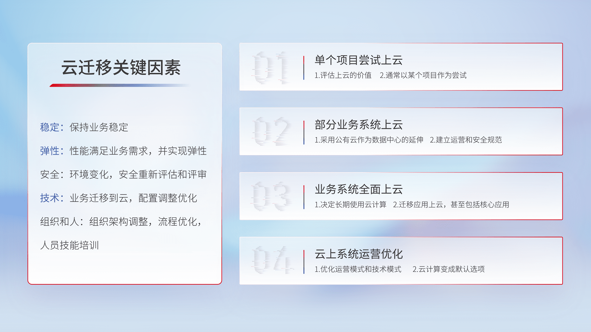 结合实际业务,,从规划设计、、、云平台选型、、、、云原生改造、、、、数据迁移、、、、集成交付,,,,迁移全过程为客户识别最佳上云路径,,,做好风险识别管理,,设计网络架构、、、身份权限、、、、安全审计合规、、、操作审计、、、日志审计、、、、监控告警策略、、、多站点容灾设计等,,,对云上基础设施进行整体规划,,,,提升IT治理水平,,以满足弹性、、、、高可用、、、、高性能的需求。。
