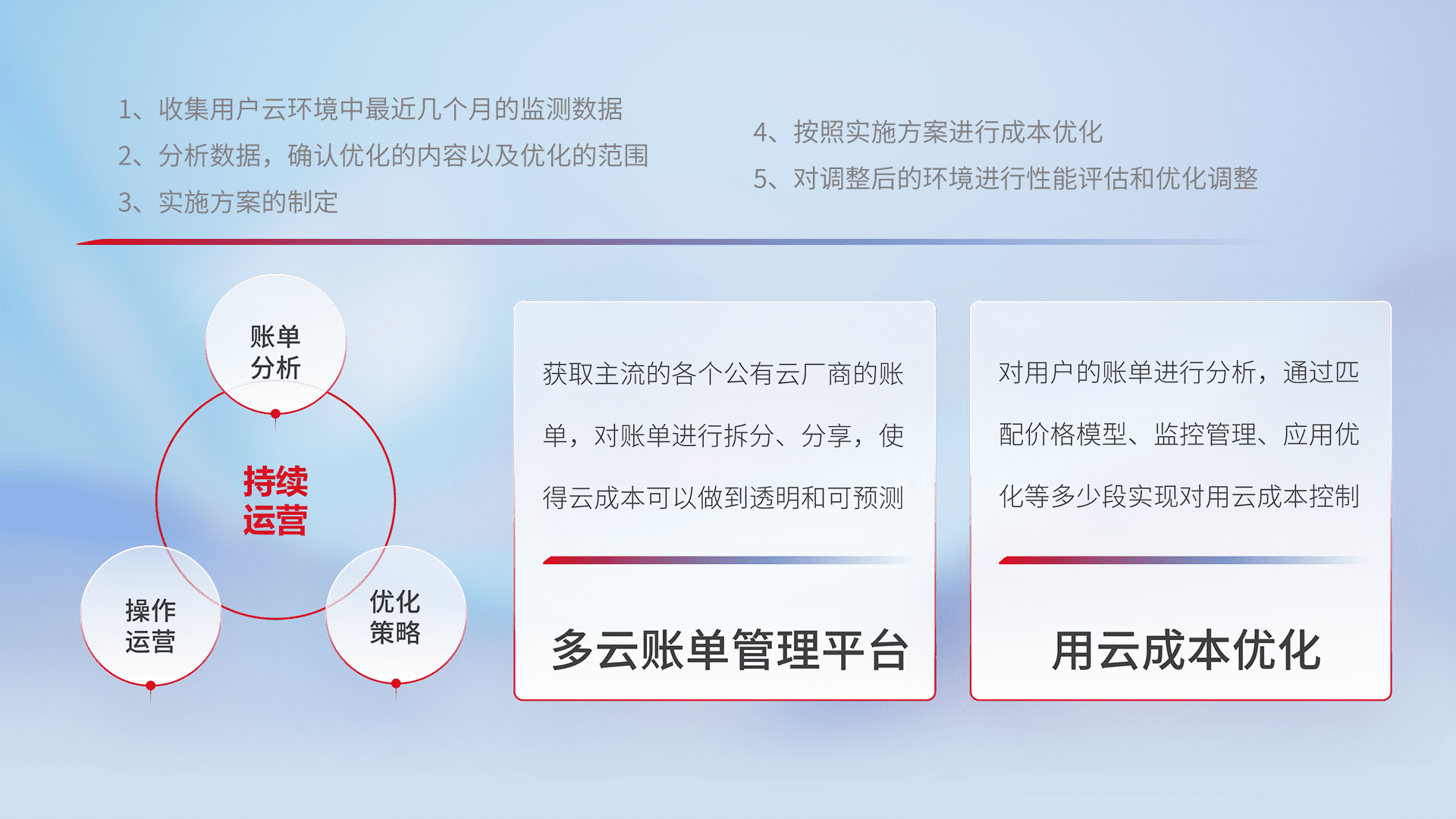 通过多云纳管,,,,以统一的资源数据模型把客户的云资源进行抽象和封装,,进而实现对多云资源的统一操作,,,,保障云资源管理的可靠性、、稳定性与可用性。。。。量身定制化运维内容,,,,配置、、、、开发运维、、补丁管理、、、、备份、、监控、、、认证和访问管理、、、、审计和日常巡检等,,,保障在用云过程中的可靠度,,,稳定度以及高可用率。。。